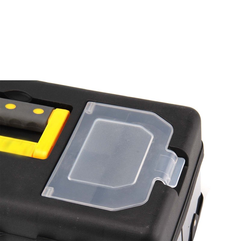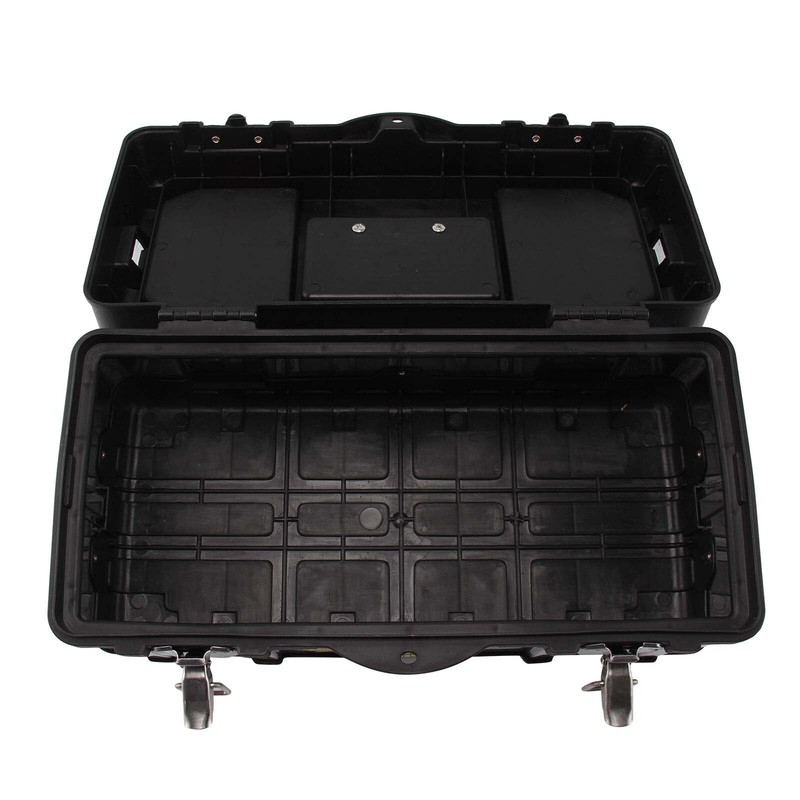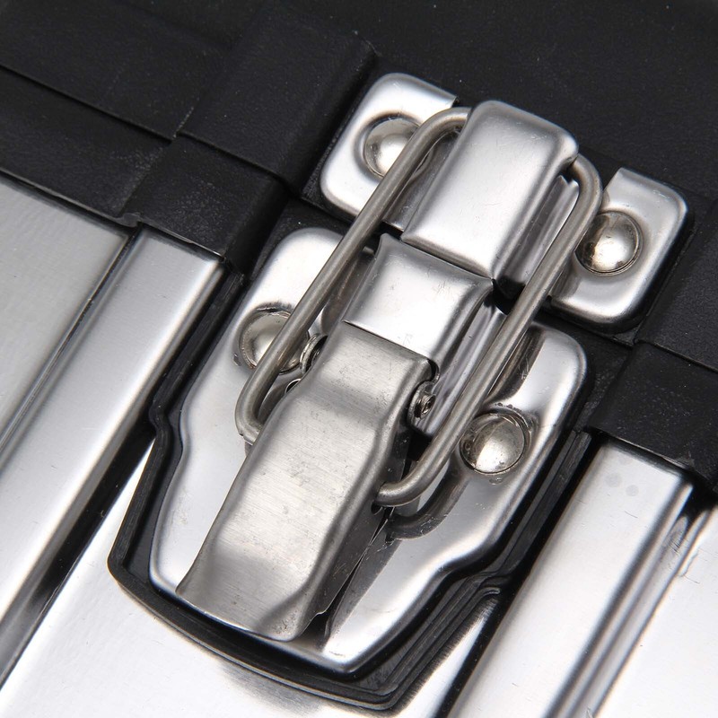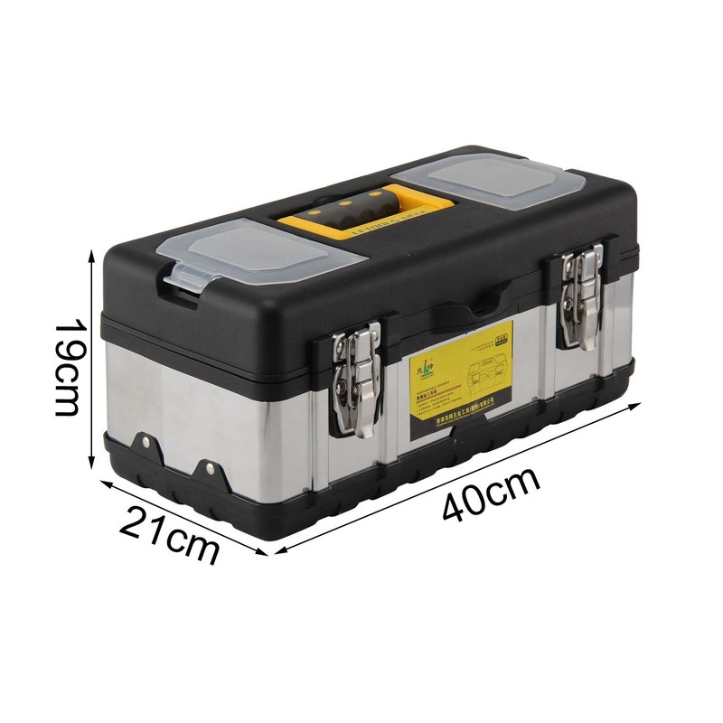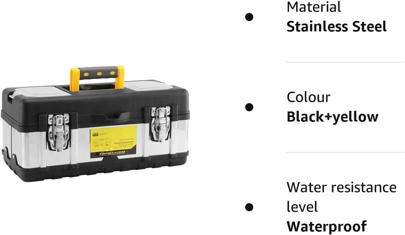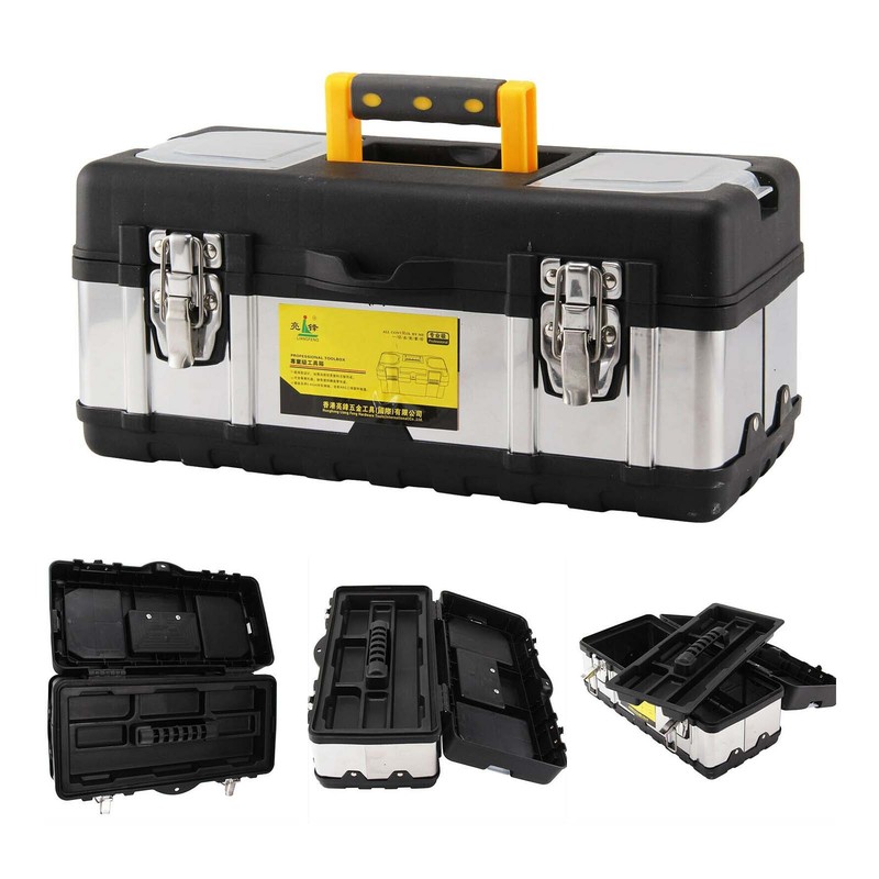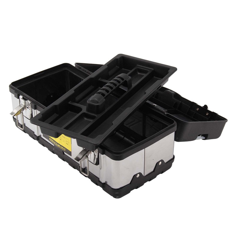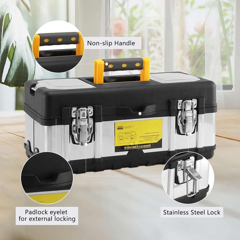 This toolbox is perfect for both professionals or DIYers! Made from impact resistant stainless steel. The tool box comes with a large amount of storage space inside as well as a removable tote tray. Also the lid of the tool box contains two handy storage compartments for screws, drill bits etc. The tool box can be secured shut with the two metal latches on the front with padlock eye. On the top of the tool box is a comfort grip carry handle.